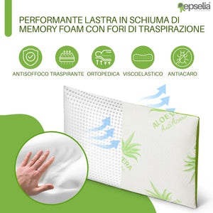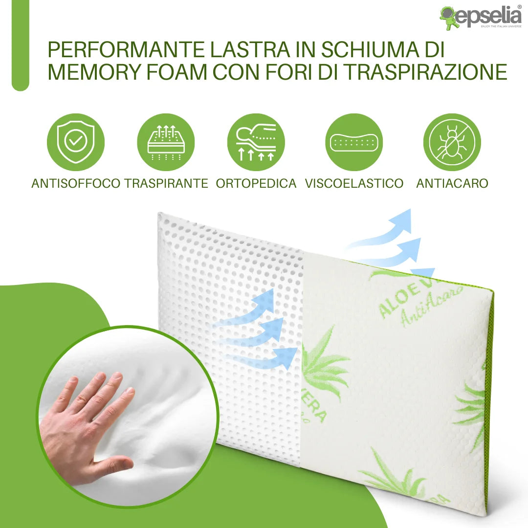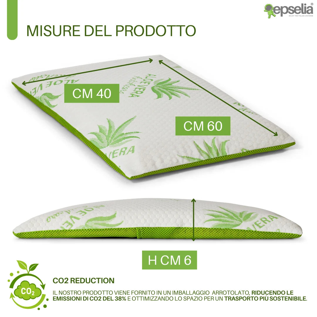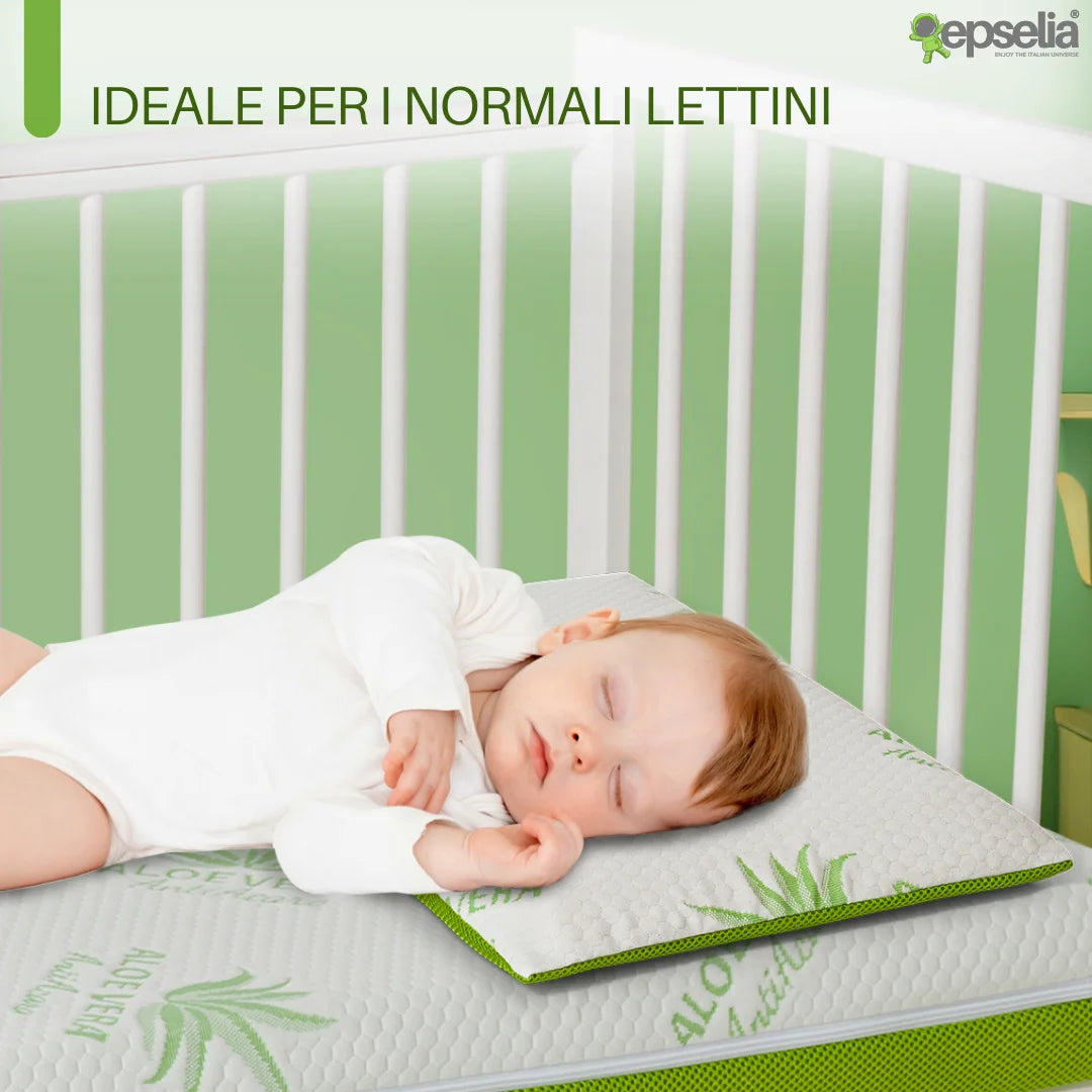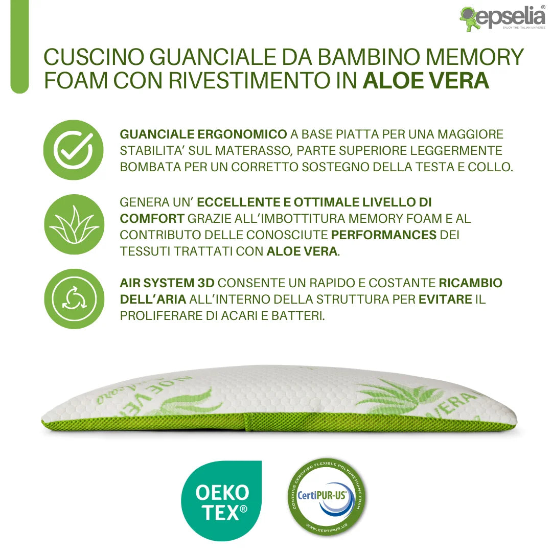 EPSELIA Cuscino Lettino per Bambini Memory Foam in ALOE VERA cm 60x40 H6 Antisoffoco Ergonomico, Anallergico e Traspirante tessuto Air 3D, Cuscino Asilo o Viaggio Sfoderabile